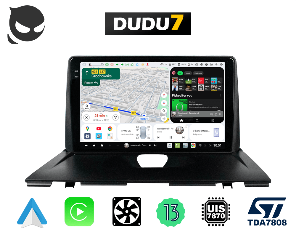 DUDU Auto wykorzystuje najnowszy chipset Unisoc UIS7870 oparty na rdzeniach Cortex-A76 i A55, który zapewnia płynne działanie i niezawodność podczas korzystania z wymagających aplikacji. Najnowszy wzmacniacz audio TDA7808 z obsługą I2S (wzmacniacz przyjmuje dźwięk w zapisie cyfrowym) zapewnia najlepszą możliwą jakość dźwięku.