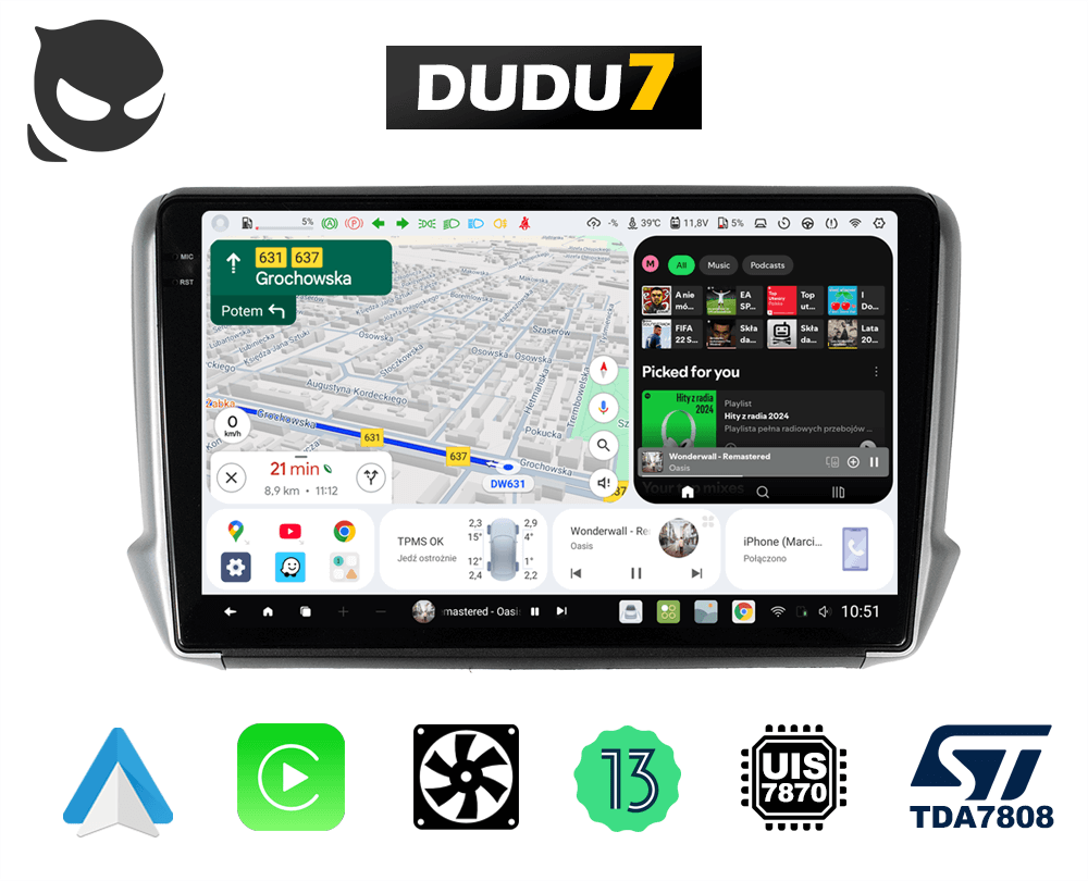 DUDU Auto wykorzystuje najnowszy chipset Unisoc UIS7870 oparty na rdzeniach Cortex-A76 i A55, który zapewnia płynne działanie i niezawodność podczas korzystania z wymagających aplikacji. Najnowszy wzmacniacz audio TDA7808 z obsługą I2S (wzmacniacz przyjmuje dźwięk w zapisie cyfrowym) zapewnia najlepszą możliwą jakość dźwięku.