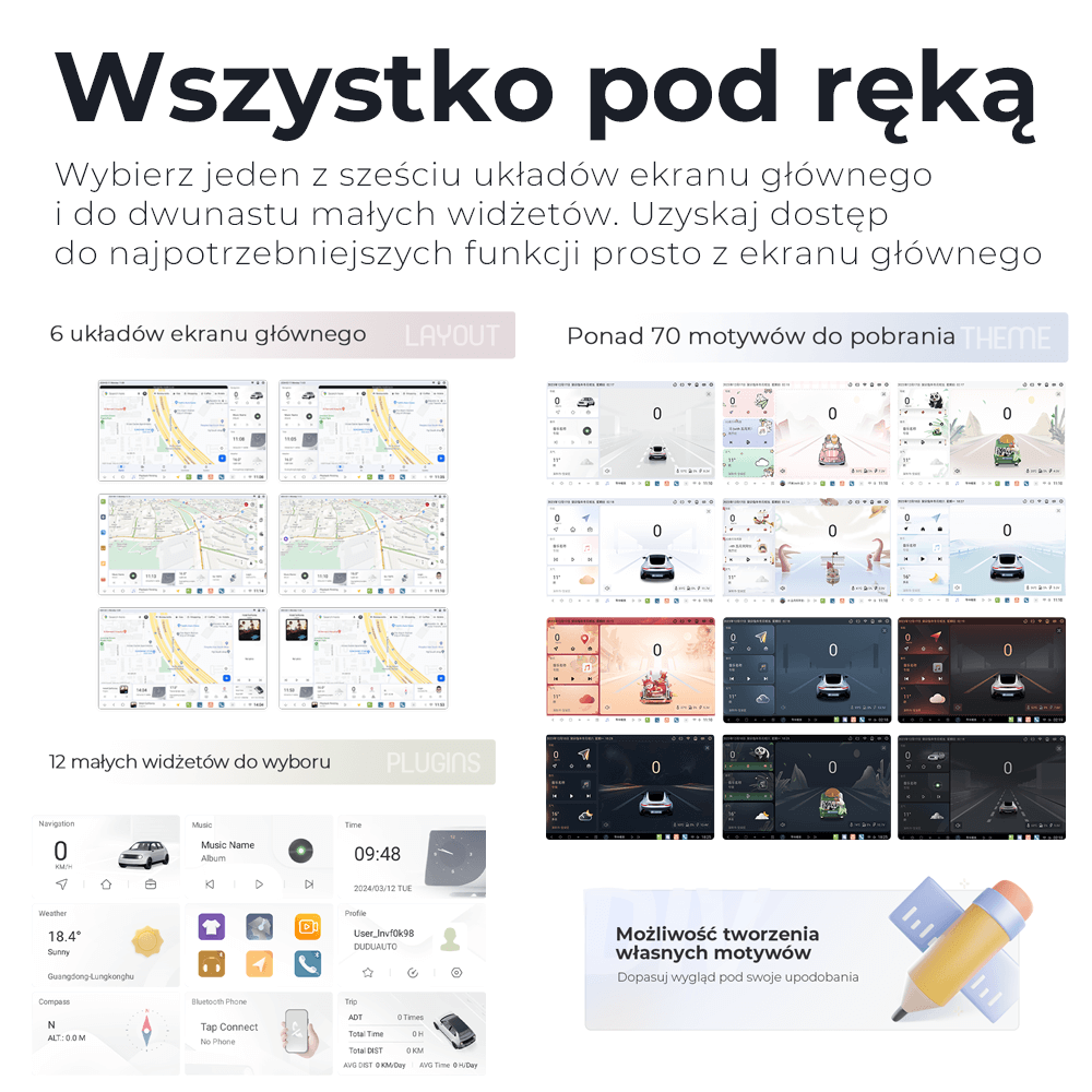 DUDU Auto działa na autorskim systemie operacyjnym DUDU OS, który oferuje intuicyjny interfejs użytkownika, obsługę gestów oraz możliwość kustomizacji, dzięki czemu możesz dostosować urządzenie do swoich preferencji i potrzeb. Dzięki wsparciu dla PIP (Obraz w obrazie), na ekranie głównym możesz wyświetlać nawet dwie aplikacje z zachowaniem dostępu do innych widżetów.