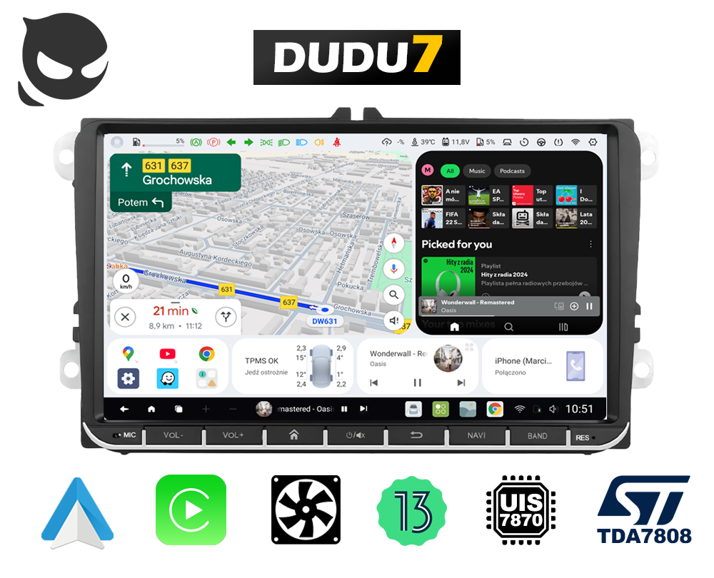 DUDU Auto wykorzystuje najnowszy chipset Unisoc UIS7870 oparty na rdzeniach Cortex-A76 i A55, który zapewnia płynne działanie i niezawodność podczas korzystania z wymagających aplikacji. Najnowszy wzmacniacz audio TDA7808 z obsługą I2S (wzmacniacz przyjmuje dźwięk w zapisie cyfrowym) zapewnia najlepszą możliwą jakość dźwięku.